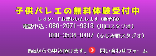 | 備考 ● 入会金/小学生以下無料 ≪入会随時≫ ● 当日の用意/レオタード、バレエシューズ ※ 1日体験時、レオタードお貸しします |